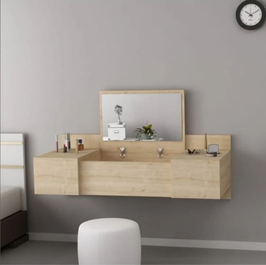 שידת איפור מרחפת בעיצוב מודרני ונקי בגימור עץ אלון טבעי, חוסכת מקום ומעניקה מראה יוקרתי לחדר השינה או לפינת טיפוח, מתאימה לשילוב עם מראה וכיסא איפור