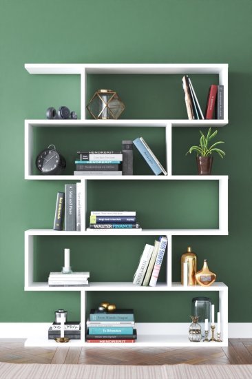 כוורת אחסון מעוצבת עם 5 תאים בסידור זיגזג ייחודי. מתאימה לספרים, חפצי נוי ואחסון דקורטיבי בעיצוב נקי בצבע לבן