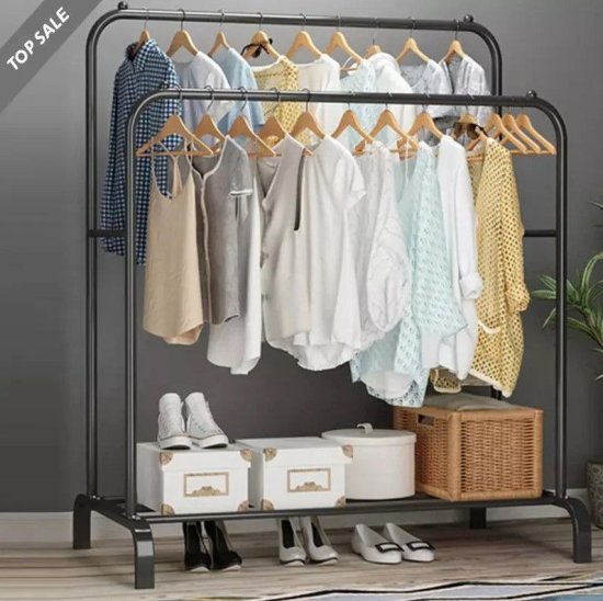 מתלה בגדים חזק ויציב עם שני מוטות תלייה לניצול מרבי של שטח אחסון. מתאים לבית, לחדר ארונות או לחנויות בגדים
